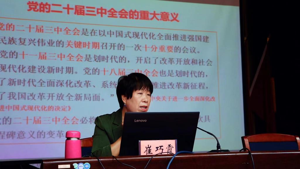 活动中,自治州学习贯彻党的二十届三中全会精神巡回宣讲团成员、博乐市党校(行政学院)高级讲师崔巧霞讲师以“高举改革开放伟大旗帜 奋力谱写中国式现代化新篇章”为主题,从“深入认识党的二十届三中全会的重大意义、 深入领会习近平总书记的重要讲话精神、深刻把握进一步全面深化改革的重大举措、认真学习贯彻落实全会精神”四个方面进行了深入浅出的阐述。宣讲既有理论高度,又有实践深度,让大家再次对党的二十届三中全会精神有了深刻感悟和理解,进一步提升了“感党恩、听党话、跟党走”的思想自觉和行动自觉,也更加激发了大家锚定回到历史最高水平奋力干事创业的激情和动力,是一次难得的精神洗礼和实践指导。