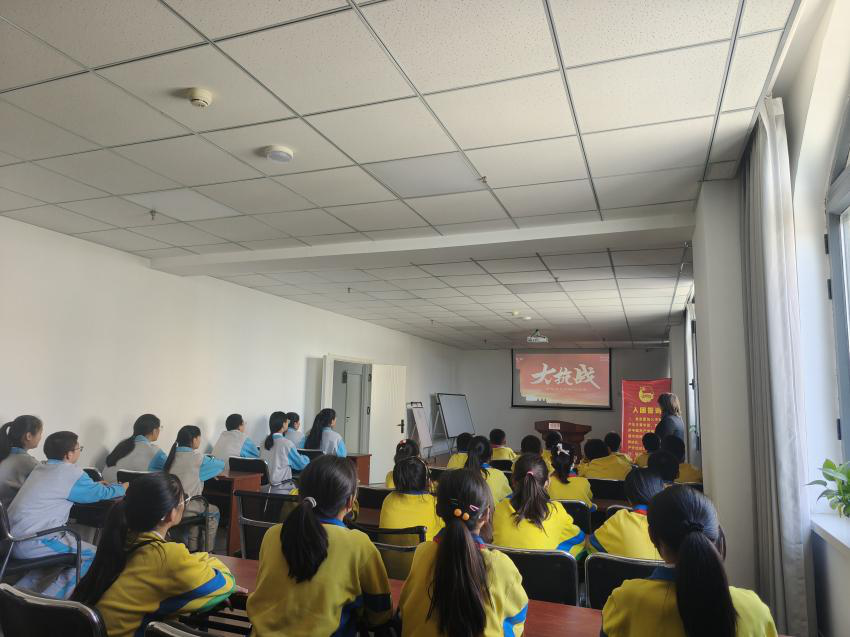 在参观结束后,党、团、队员们齐聚放映室观看“九一八事变”纪录片,同学们在看到纪录片中同胞们无助的眼神、看到山河破碎的惨状时,他们的脸上满是悲愤,随着纪录片的一步步推进,也看到了中华儿女奋起抵抗的英勇身姿,无数的仁人志士抛头颅、洒热血,他们以顽强的意志和不屈的精神与侵略者进行了长达十四年的艰苦抗战。最后,大家重温入团誓词,那一句句坚定有力的誓词,在室内回荡,大家的声音中充满了对祖国的热爱、对历史的铭记以及对未来的决心。