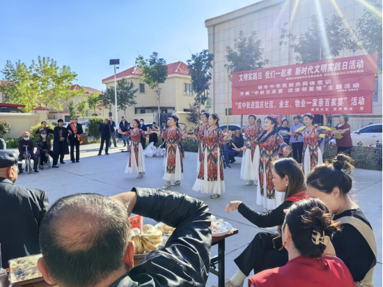 活动更是精心准备了文艺表演环节,编排了多个节目,歌唱和舞蹈等节目轮番上演。为了增添活动的趣味性,社区居民还自发组织了表演节目,每一个节目都赢得了现场观众的热烈掌声。家住玉泉华庭的居民辛铁森开心地说道:“中秋节就是要热热闹闹地过才有意思!这次‘百家宴’活动,让大家以一种家常互动的方式,聚在一起、玩在一起、吃在一起,不仅加强了各民族居民之间的感情,更收获了邻里间的深厚情谊。”