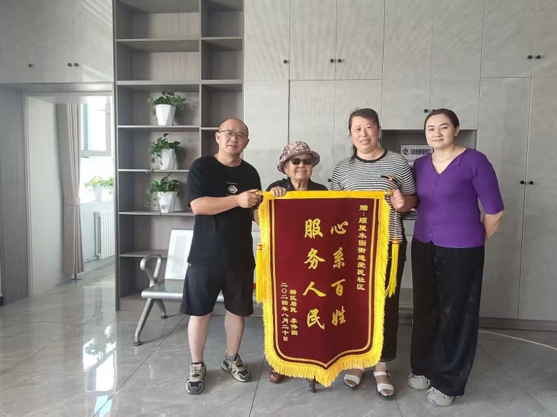 沈桂英老人将印有“热情服务解难题认真细心尽职责”几个大字的锦旗送至爱民社区党总支书记刘群手中,表达对社区工作人员心系群众、为民服务的感激之情,并表示:“社区干部就像我的家人一样,每当我遇到难处的时候,都会第一时间出面帮我解决,无微不至的关心,让我倍感温暖。”