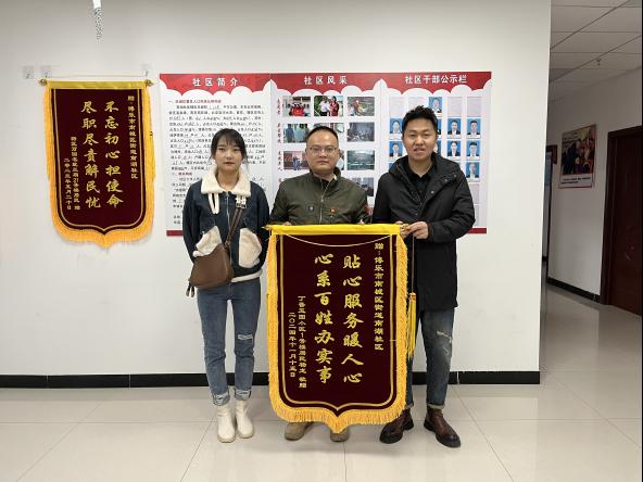 这天,南湖社区业主委员会主任李保东来到社区,手里拿着印有“尽职尽责心系群众 排忧解难服务居民”的锦旗郑重的交到南湖社区党总支书记与副书记的手中,代表丁香玉园全体业主对南湖社区的工作给予了高度评价。