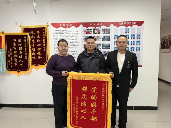 近日,家住阳光华庭小区的居民朱爱利来到社区,为社区送上写有“党的好干部 群众贴心人”的锦旗,表达对南湖社区干部的感谢。