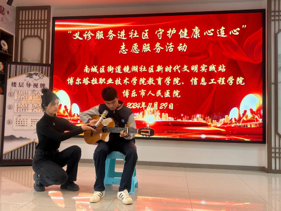 此次活动内容丰富,形式多样,不仅为居民提供了专业的医疗义诊服务,还带来了精彩纷呈的文艺表演,赢得了广大居民的热烈欢迎。活动在博尔塔拉职业技术学院学生带来的吉他弹唱《玫瑰》声中拉开序幕,表演者用深情的吉他伴奏和动人的歌声,为现场观众带来了一场视听盛宴。紧接着,太极表演《太极之境》以其独特的韵味和深厚的文化底蕴,赢得了现场观众的阵阵掌声。表演者们通过太极的招式和动作,展示了中华传统文化的博大精深,同时也传递了健康的生活理念。