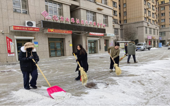 连续的降雪导致小区出入口积雪结冰,给居民群众出行带来诸多不便。为保障居民群众安全出行,12月6日上午,北京南路社区新时代文明实践站志愿者,开展“铲雪除冰便民行”志愿服务活动。