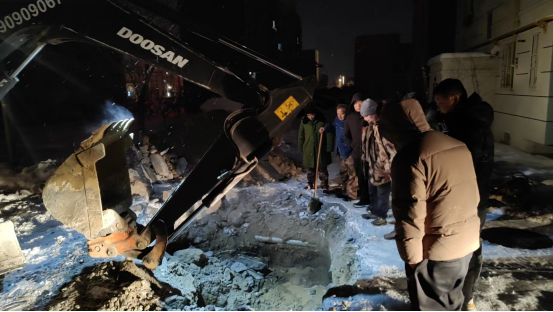 准备工作分两方面进行,一方面是社区工作人员在居民群里发布维修暖气管道的通知,让居民把停留在暖气管道附近的汽车开走,叮嘱家里有老人孩子的做好晚上的保暖工作。另一方面,物业联系挖掘机、组织抢修队伍赶往现场。由于天气寒冷、照明不足、水电气网线路复杂,导致挖掘工作难度倍增,根据以往经验,需要将9号楼楼前的管道逐渐挖出,找到漏水点,工作人员奋战至凌晨五点挖掘工作才完工。