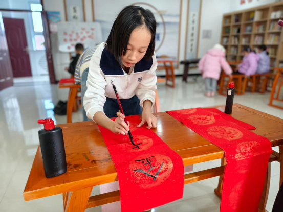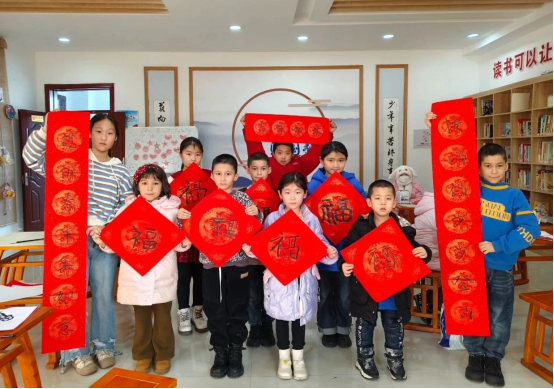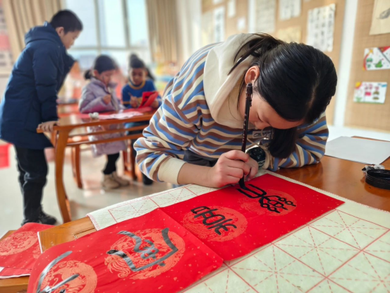 孩子们用稚嫩而坚定的笔触,挥毫泼墨,不一会儿,一幅幅喜庆的“福”字和春联便铺满了小课堂,他们的作品虽然略显生涩,但却充满了童真和创意,孩子们体验了中华文化的同时也散发出满满的新春气息。