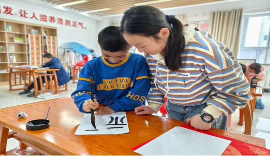 活动中,大学生志愿者老师们在现场介绍了“福”字的由来,并展示了各种“福”字的写法,随后又介绍了毛笔的使用方法,基本笔画的书写方法,孩子们听得十分认真。随后,在“红领巾小课堂”老师们的带领下,孩子们满怀期待,他们纷纷拿起毛笔,蘸上墨汁,在红纸上认真地书写起来,感受中华文化的博大精深。