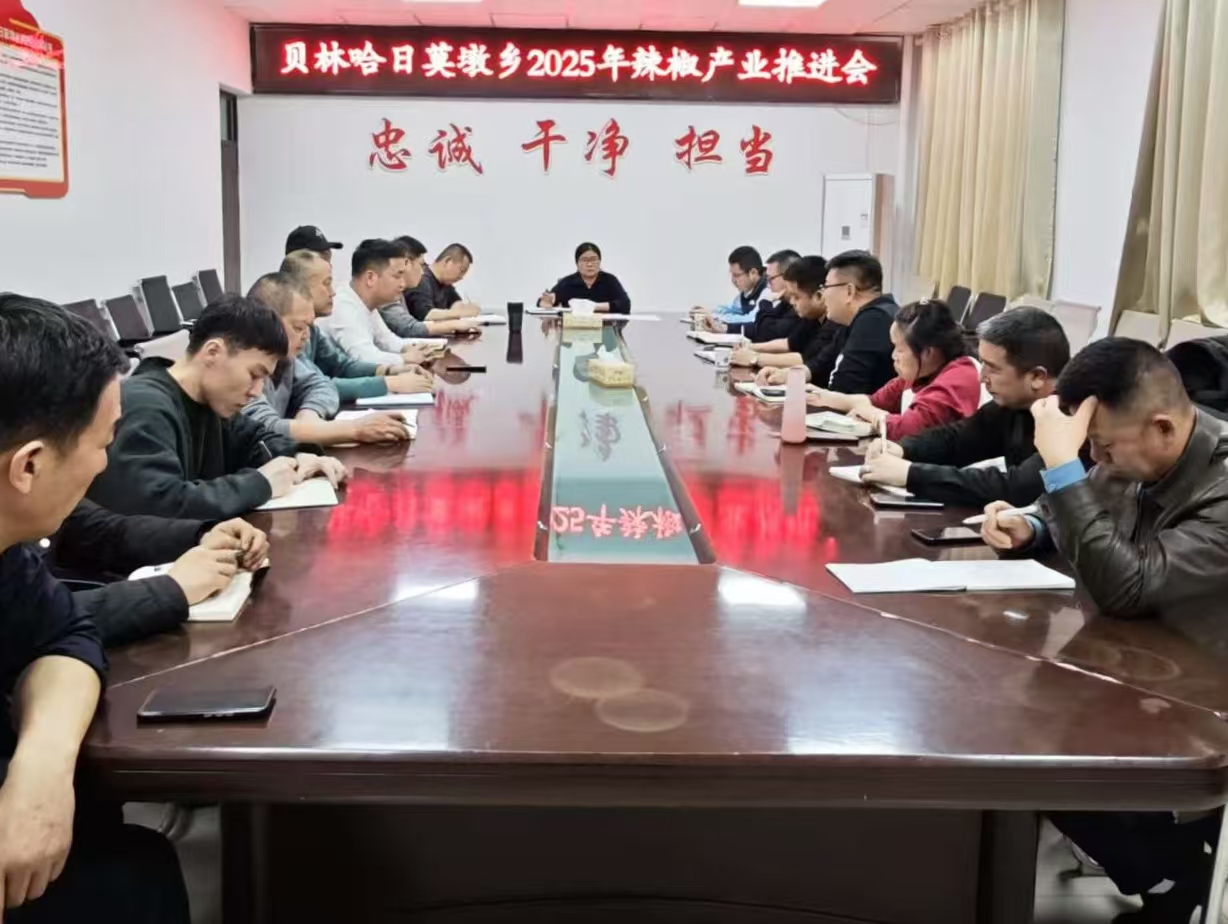 贝林哈日莫墩乡2025年辣椒产业推进会于2月6日在贝林哈日莫墩乡人民政府会议室内召开。与会人员贝林哈日莫墩乡领导班子成员、各村队党支部书记,以及博乐市阳光农业科技开发有限责任公司总经理,会上共同交流探讨为贝乡辣椒产业的蓬勃发展出谋划策。