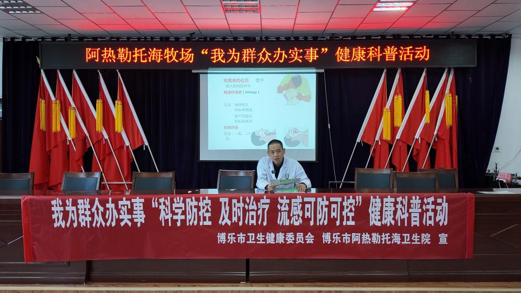 博乐市阿热勒托海牧场卫生院党支部书记杨建林:“今天我们在这里举行这个“流感可防可控”及时治疗,这个科学防控的一个健康科普活动,要告诉大家这个流感并不可怕,我们要及时的去预防,及时治疗,要抓住传染病预防的三个关键环节,及时控制传染源、切断传播途径、保护易感人群,对于老年人、小孩和体质较弱的人呢,及时接种这个流感疫苗,然后这个在流感爆发季节,这个要去勤洗手,多通风,少到这个人员密集的场所去,要戴口罩,注意保护自己的这个身体健康,流感季节这个会持续到3月份,所以大家在这个流感多发季节,一定要注意及时的治疗,科学的防控。本次活动为期两天,旨在为村民提供免费的医疗检查,健康咨询等服务,将优质的医疗资源,持续的送到村民的家门口。”