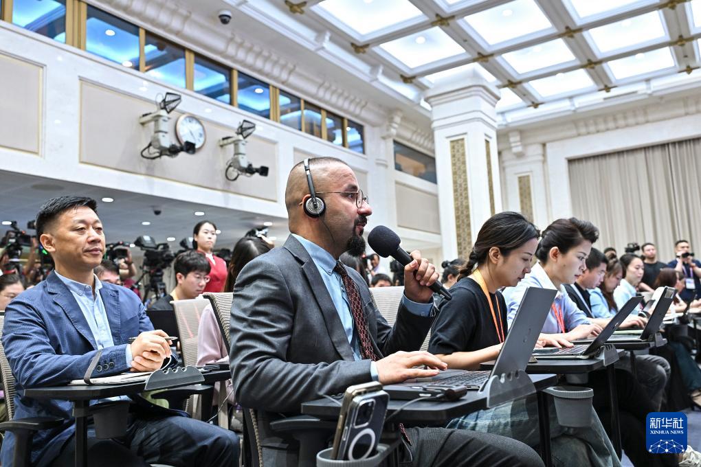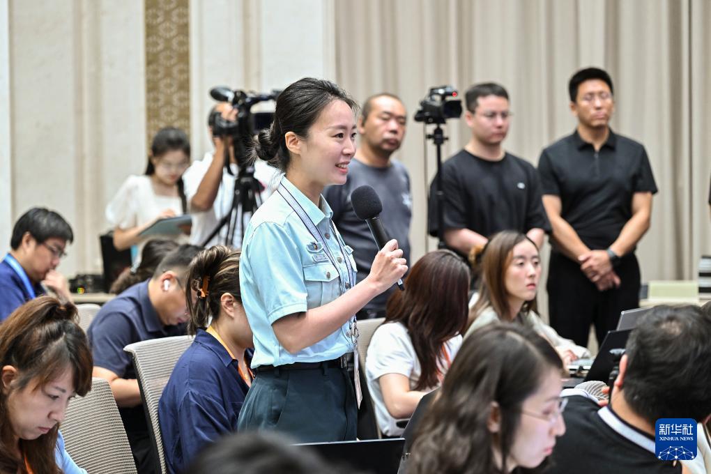 8月20日,国务院新闻办公室在北京举行新闻发布会,阅兵领导小组办公室副主任、中央军委联合参谋部作战局少将副局长吴泽棵,中国人民解放军中部战区阅兵指挥机构办公室常务副主任、政治工作部少将副主任徐贵忠介绍阅兵准备工作有关情况,并答记者问。这是记者在现场提问。新华社记者 李鑫 摄