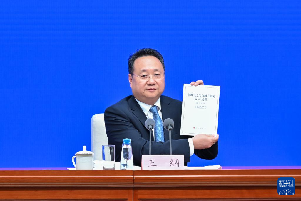 9月19日,国务院新闻办公室在北京举行新闻发布会,发布《新时代党的治疆方略的成功实践》白皮书,中央宣传部副部长王纲,新疆维吾尔自治区党委副书记、自治区主席艾尔肯·吐尼亚孜,新疆维吾尔自治区党委常委、自治区常务副主席陈伟俊,新疆维吾尔自治区党委常委、宣传部部长王建新出席,介绍白皮书有关情况并答记者问。这是王纲展示《新时代党的治疆方略的成功实践》白皮书。新华社记者 李鑫 摄