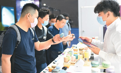 在日前举办的首届广州国际电子及电器博览会上,来自消费类电子、移动电子及配件、智能穿戴、电竞游戏、家用电子等领域的超过1000家企业,携逾6万件产品参展。图为观众在展会上参观选购一款迷你音箱。新华社记者 卢汉欣 摄