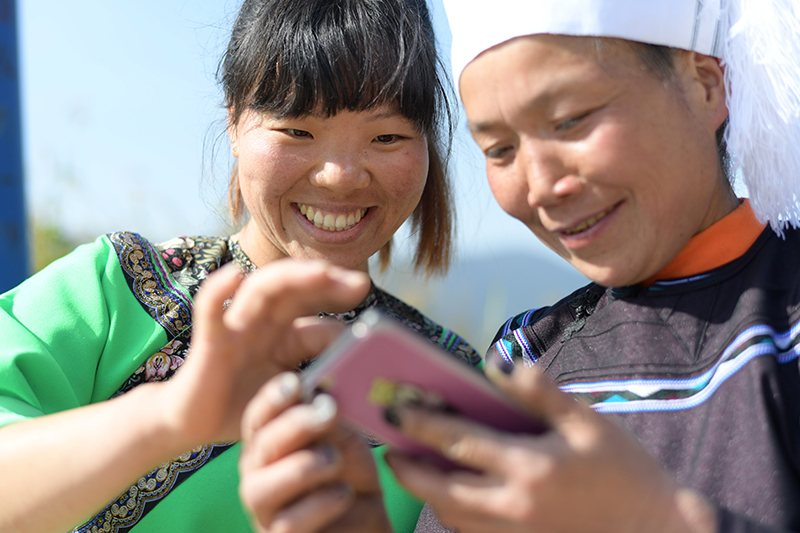 在贵州省黔东南苗族侗族自治州榕江县水尾水族乡拉术村,一位村民(右)在学习使用手机(2020年10月24日摄)。新华社记者 杨楹 摄