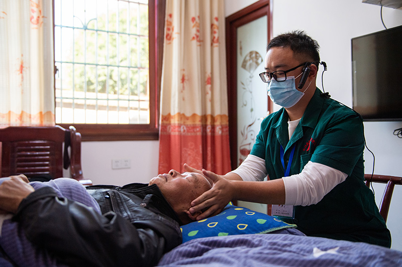 2021年11月12日,在湖南省长沙市长沙县果园镇田汉社区,医务人员彭永(右)为居家老人做头部推拿。新华社记者 陈思汗 摄