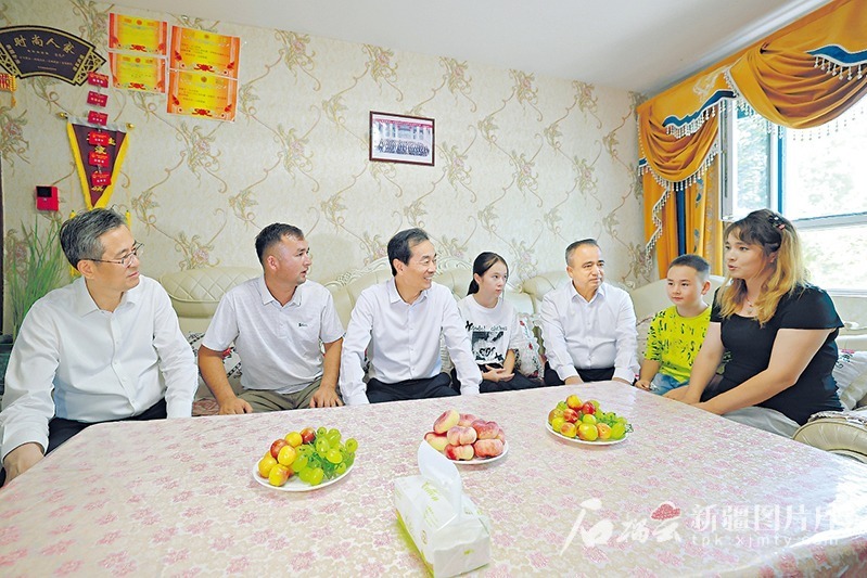 7月4日,自治区党委书记、兵团党委第一书记陈小江,自治区党委副书记、自治区主席艾尔肯·吐尼亚孜在兵团第十四师昆玉市224团和泰新区,走进居民艾力·艾麦尔家中,与一家人亲切拉家常,询问工作、收入、子女教育等情况。石榴云/新疆日报记者 崔志坚摄