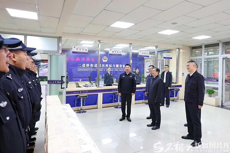 10月5日,自治区党委书记、兵团党委第一书记、第一政委陈小江在乌鲁木齐市公安局二道桥街道派出所,看望慰问基层政法干警,向节日期间坚守岗位的一线干部职工致以亲切问候。石榴云/新疆日报记者 崔志坚摄