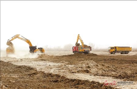 施工人员在奎屯河引水工程项目现场作业(3月27日摄)。该工程建成后将为兵团第七师、奎屯市、乌苏市、克拉玛依市独山子区等地居民生活、工业用水及200余万亩农田的灌溉提供保障。王志清摄