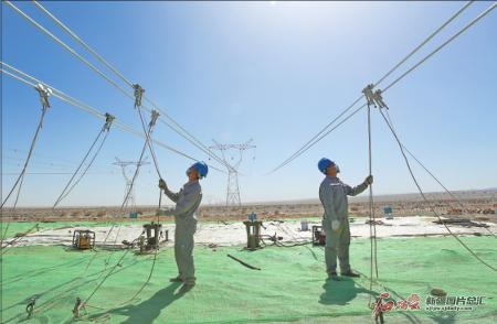 在自治区重点项目莎车—和田Ⅱ回750千伏输变电工程Ⅱ标段,施工人员在架设线路(4月10日摄)。该工程起于已建750千伏莎车变电站,止于已建750千伏和田变电站,线路全长约326千米,预计2021年采暖季前投运。许晓龙摄