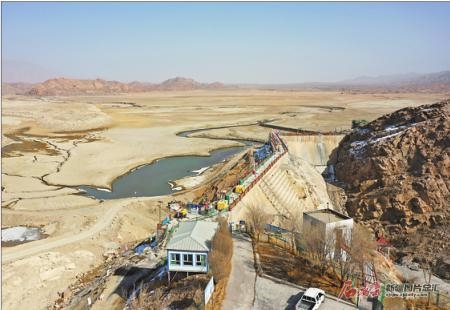 工人在八一水库施工(3月19日摄)。位于和硕县乌什塔拉回族乡的八一水库于2020年启动水库除险加固工程。李鹏举摄