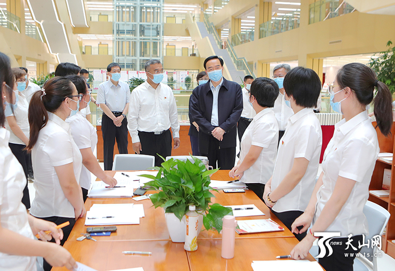 7月14日,自治区党委书记陈全国在新疆医科大学调研。这是陈全国来到位于乌鲁木齐市河马泉新区的新疆医科大学雪莲山校区图书馆,了解学校党史学习教育开展情况。记者 崔志坚摄