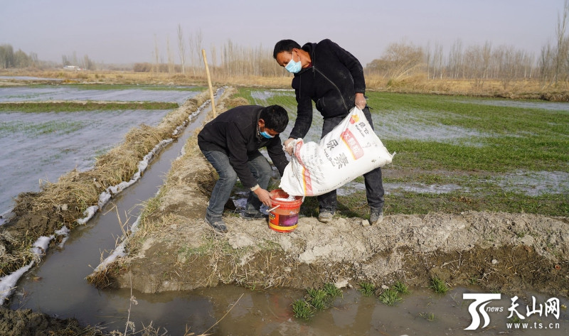 11月11日,温宿县恰格拉克乡前进村农民在为冬小麦追肥。目前,该县种植的34.5万亩冬小麦进入冬管的关键时期,农民加紧为冬小麦追肥、放冬水,确保冬小麦安全越冬。颜寿林摄