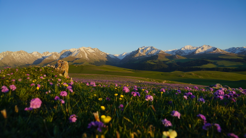 烂漫的山花尽情绽放,剽悍的骏马自由驰骋,蓝天白云映衬之下,被春雪浸润后的新疆别有一番景致。在新疆赏山花,可以从3月一直持续到8月。伊犁河谷沿线的山花从羞答答地零星绽放到漫山遍野地肆意怒放,在新源县、巩留县、特克斯县、伊宁市,都有不同风景。盛夏时节,大家还可以去喀纳斯景区和青河县看大片深处的山花。在花海深处,共享人与自然的和谐美好。