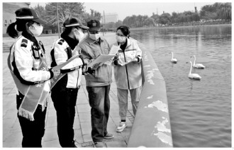 2021年10月10日,新疆维吾尔自治区库尔勒市公安局交警大队携手库尔勒市志愿服务协会、库尔勒绿丝带守护天鹅志愿服务队在杜鹃河畔开展“保护野生天鹅 促进生态建设”主题活动,向市民和游客宣传保护野生天鹅注意事项。近年来,库尔勒市加强生态环境保护,每年都会吸引众多的野生天鹅在该市各水域越冬,并且逐渐由候鸟变成了留鸟,成为当地的环保名片。 严万海 摄