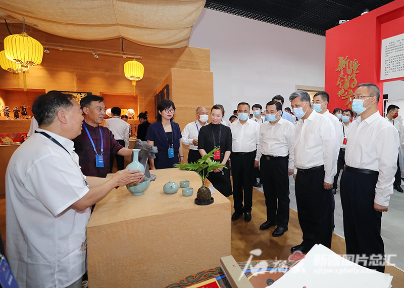 7月31日,文化和旅游部党组书记、部长胡和平,自治区党委书记马兴瑞,自治区党委副书记、自治区主席艾尔肯·吐尼亚孜等参观了解2022“新疆是个好地方”对口援疆19省市非物质文化遗产展展出的汝窑瓷器。天山网-新疆日报记者 崔志坚摄