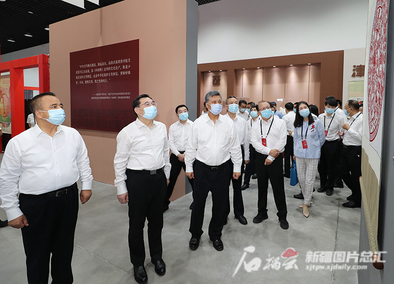 7月31日,文化和旅游部党组书记、部长胡和平,自治区党委书记马兴瑞,自治区党委副书记、自治区主席艾尔肯·吐尼亚孜等参观2022“新疆是个好地方”对口援疆19省市非物质文化遗产展展出的剪纸作品《华夏一家亲 同为圆梦人》。天山网-新疆日报记者 崔志坚摄