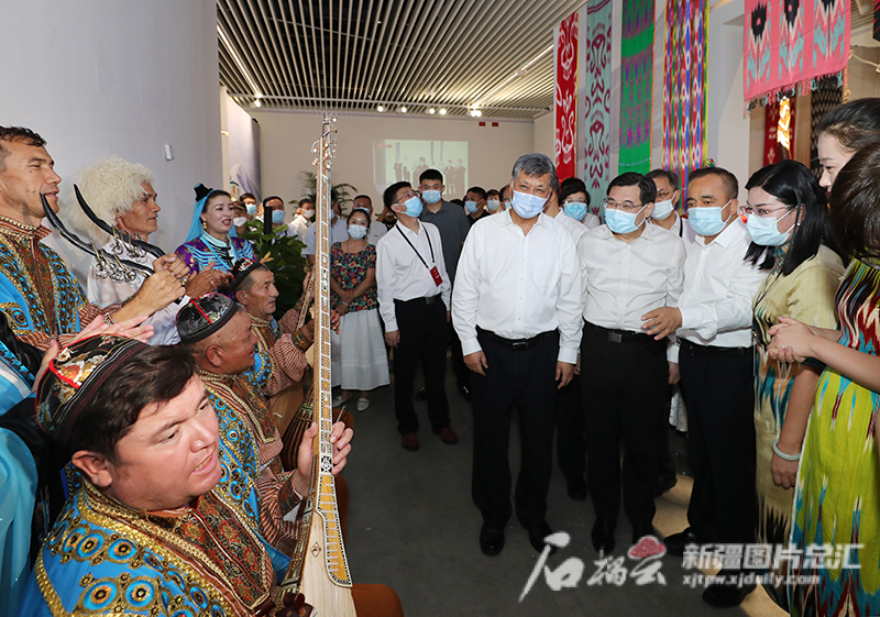 7月31日,文化和旅游部党组书记、部长胡和平,自治区党委书记马兴瑞,自治区党委副书记、自治区主席艾尔肯·吐尼亚孜等观看2022“新疆是个好地方”对口援疆19省市非物质文化遗产展上演出的和田赛乃姆。天山网-新疆日报记者 崔志坚摄