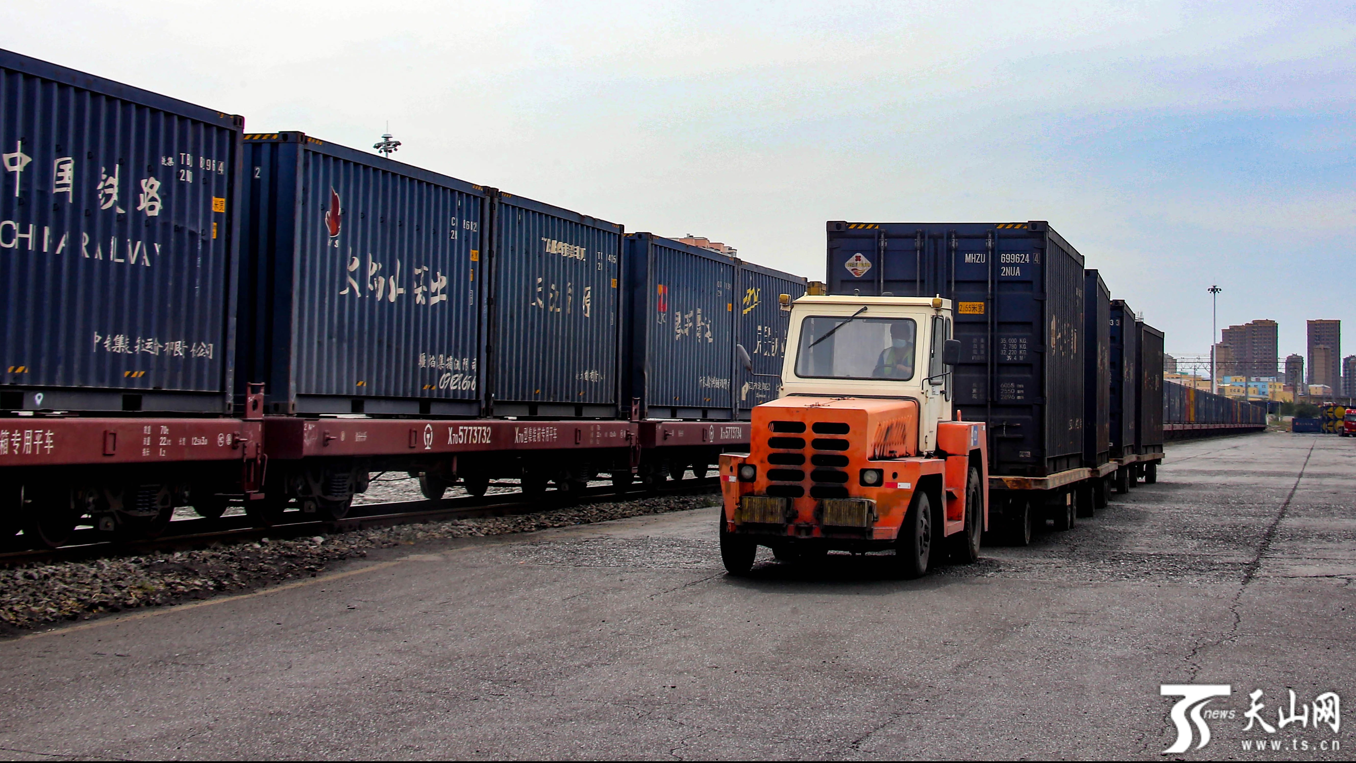 8月16日,一辆集装箱平板车在拉运集装箱。中国铁路乌鲁木齐局集团有限公司乌鲁木齐货运中心乌东营业部在做好疫情防控工作的前提下,全力保障铁路运输和物流畅通。天山网-新疆日报记者蔡增乐摄