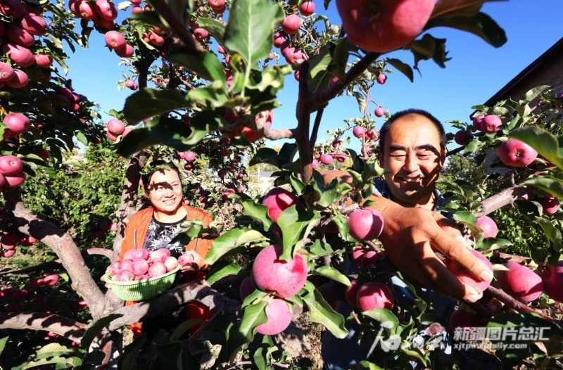 9月22日,阿勒泰市红墩镇博肯布拉克村,村民张金星夫妇在采摘自家种植的苹果。阿尔达克·拜斯汗 摄