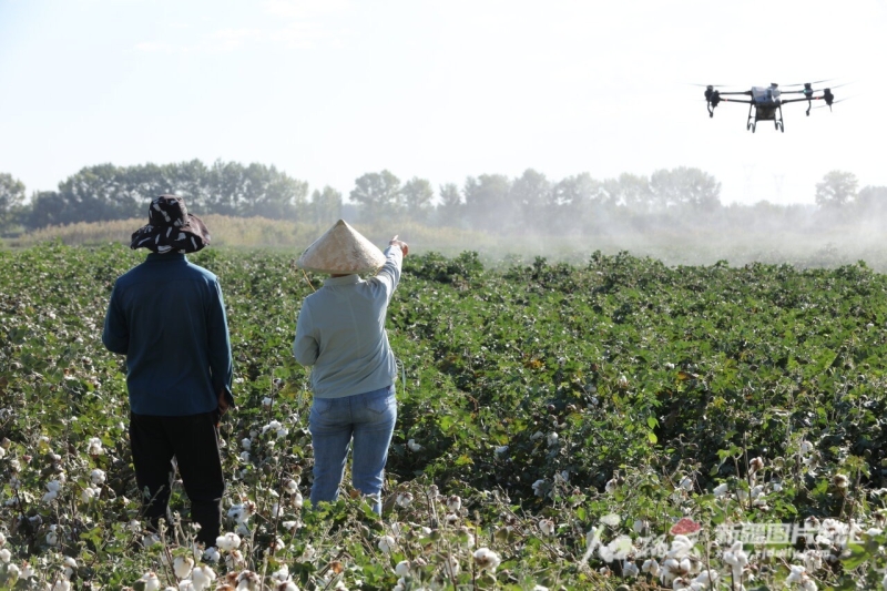 9月2日,玛纳斯县下八家户村村民用无人机在棉田里喷洒脱叶剂。田庆摄