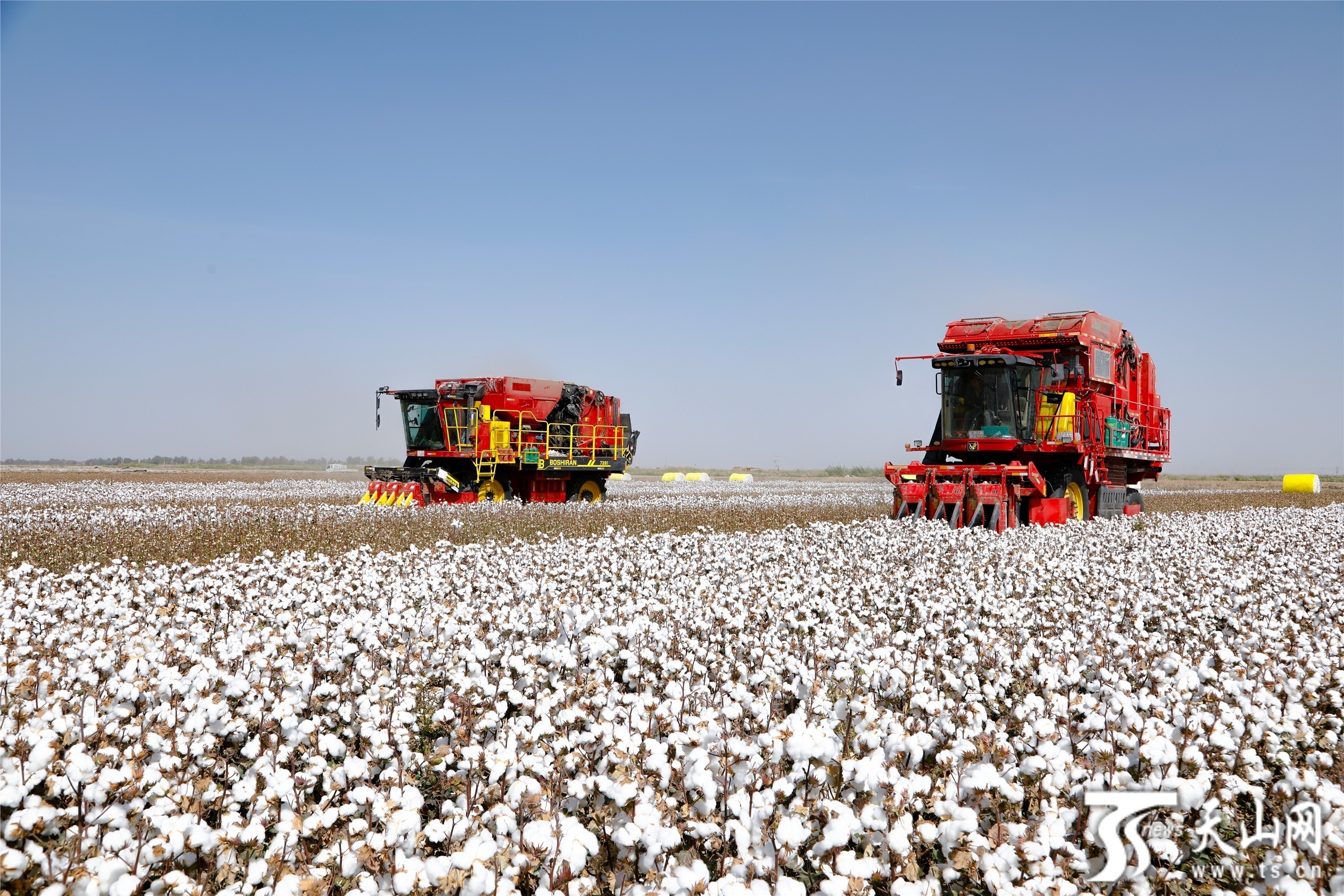 时下,沙湾市百万亩棉花吐絮成熟,大型采棉机穿梭在白色棉海中,争分夺秒锁定今年的丰收形势。库尔勒市的棉花进入采摘期,为保障棉花采摘工作顺利进行,当地成立棉花采收工作领导小组,组织农业技术人员深入田间地头,为农户开展技术培训指导,从源头上提升棉花采收质量。