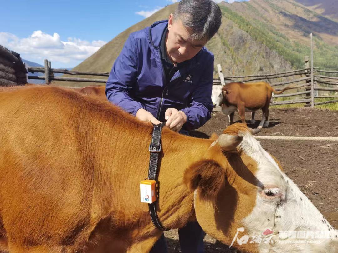 中国电信新疆公司工作人员为养殖户的牛戴上“5G智慧项圈”。中国电信新疆公司供图