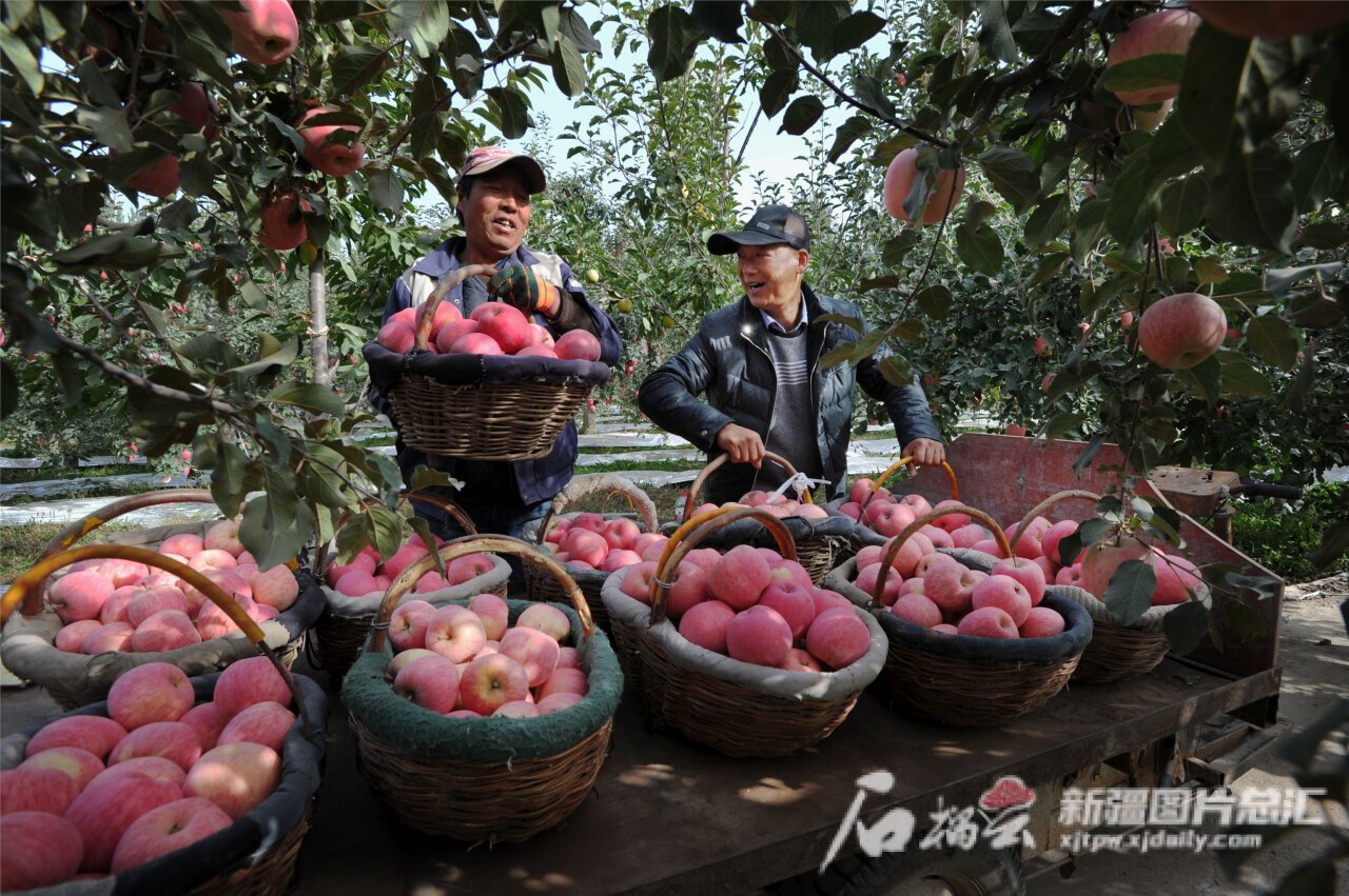 新疆红旗坡农业发展集团有限公司果农在采摘苹果,准备上市销售(资料图)。杨硕 摄