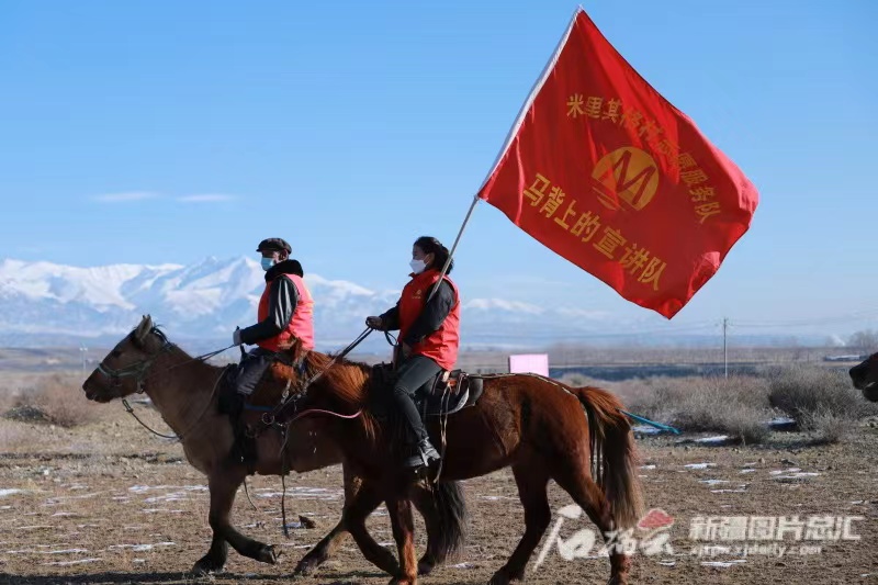 11月14日,温泉县查干屯格乡米里其格村“马背宣讲队”深入冬牧场宣传党的二十大精神。江直言摄