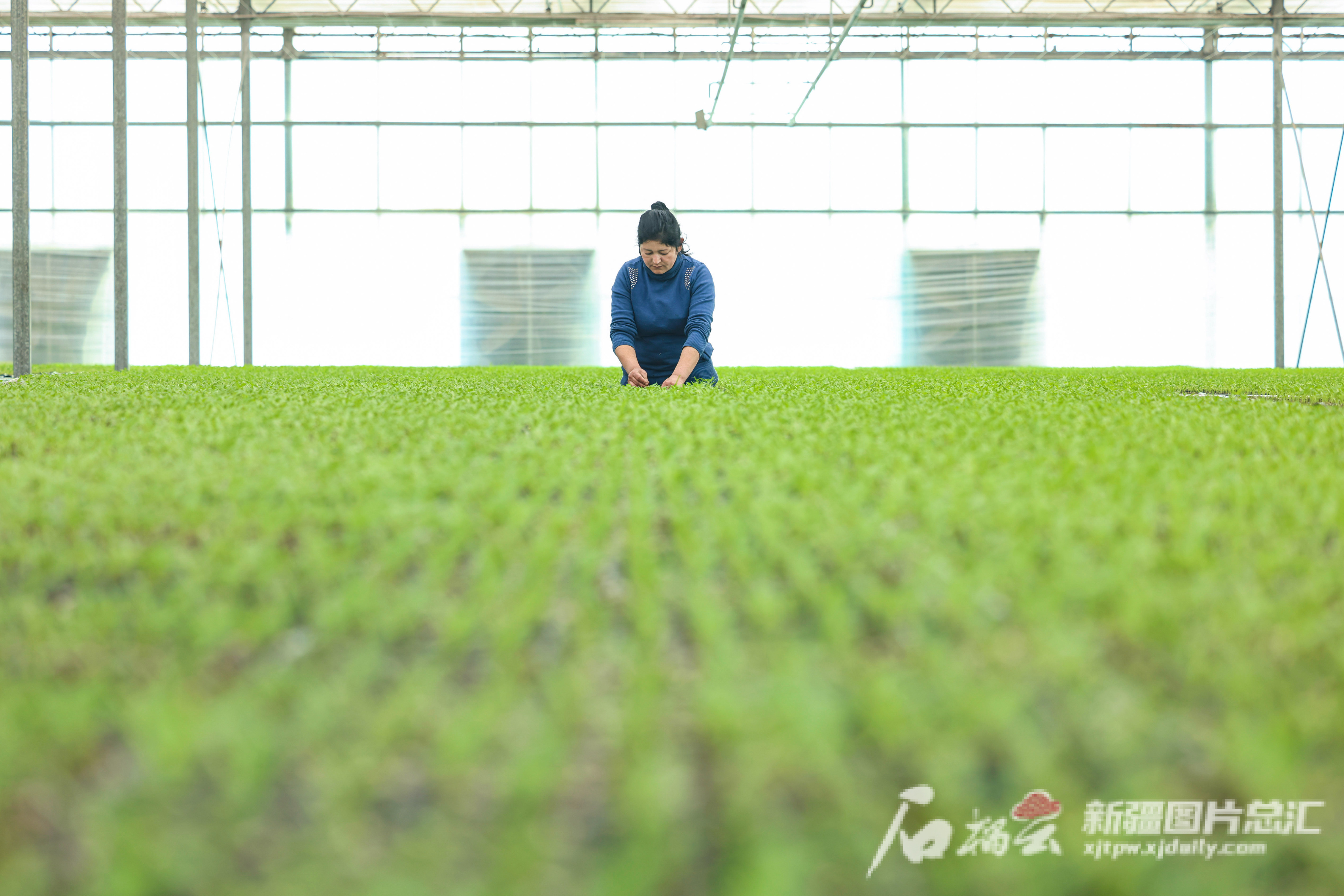 1月30日,员工在设施农业大棚培育辣椒苗。眼下,库车市比西巴格乡设施农业育苗中心培育的西红柿、辣椒、莲花白等80万株蔬菜苗长势喜人,预计2月底可移栽大田种植。袁欢欢摄