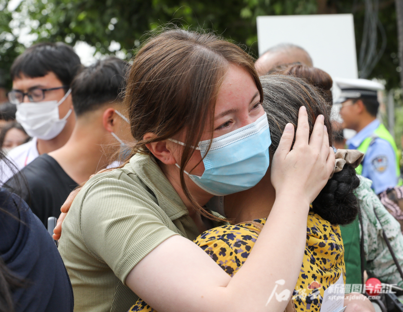 6月7日,和田地区天津高级中学考点,考生走出考场后与家人拥抱。 许晓龙摄