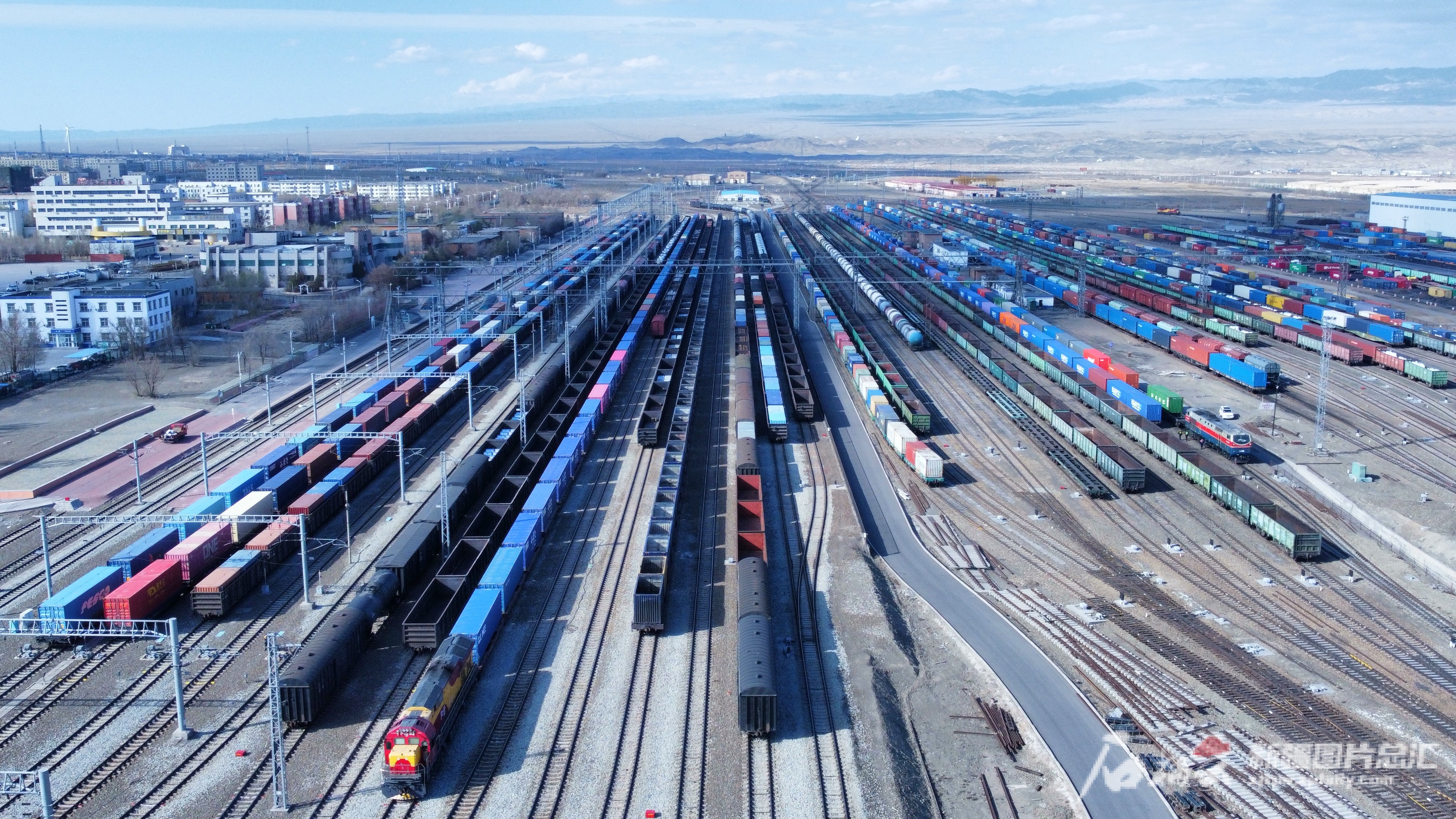 4月20日,阿拉山口站编组场内停靠着待发的中欧班列及其他出入境货物列车。陈乾 摄