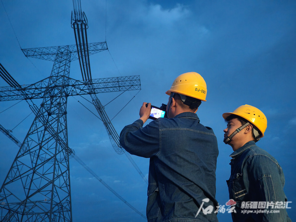 7月11日,新疆送变电有限公司员工对昌吉—古泉±1100千伏特高压直流输电工程铁塔进行红外测温。田世强 摄