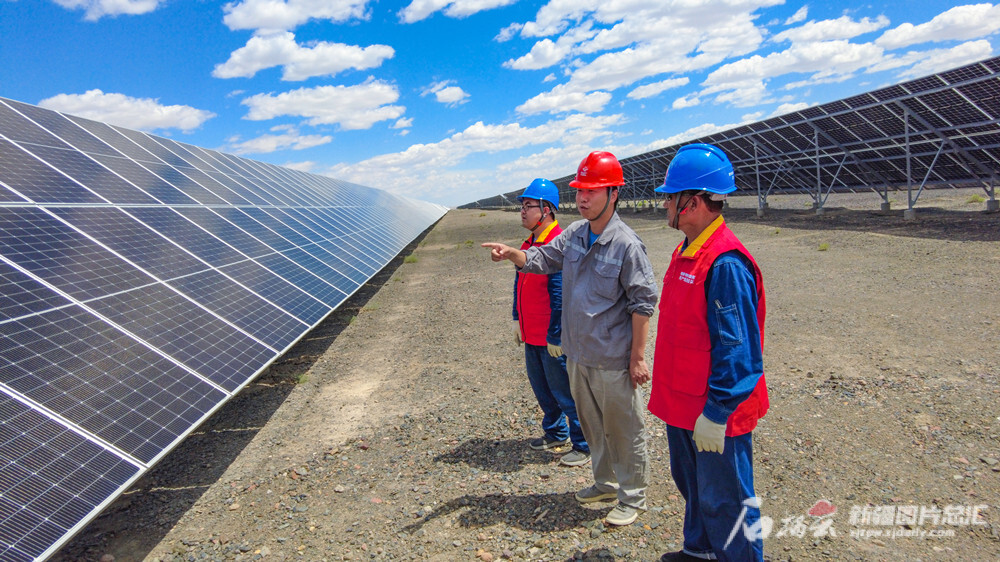 7月11日,国网新疆电力有限公司奎屯供电公司员工在光伏发电场了解设备运行情况。徐晨 摄