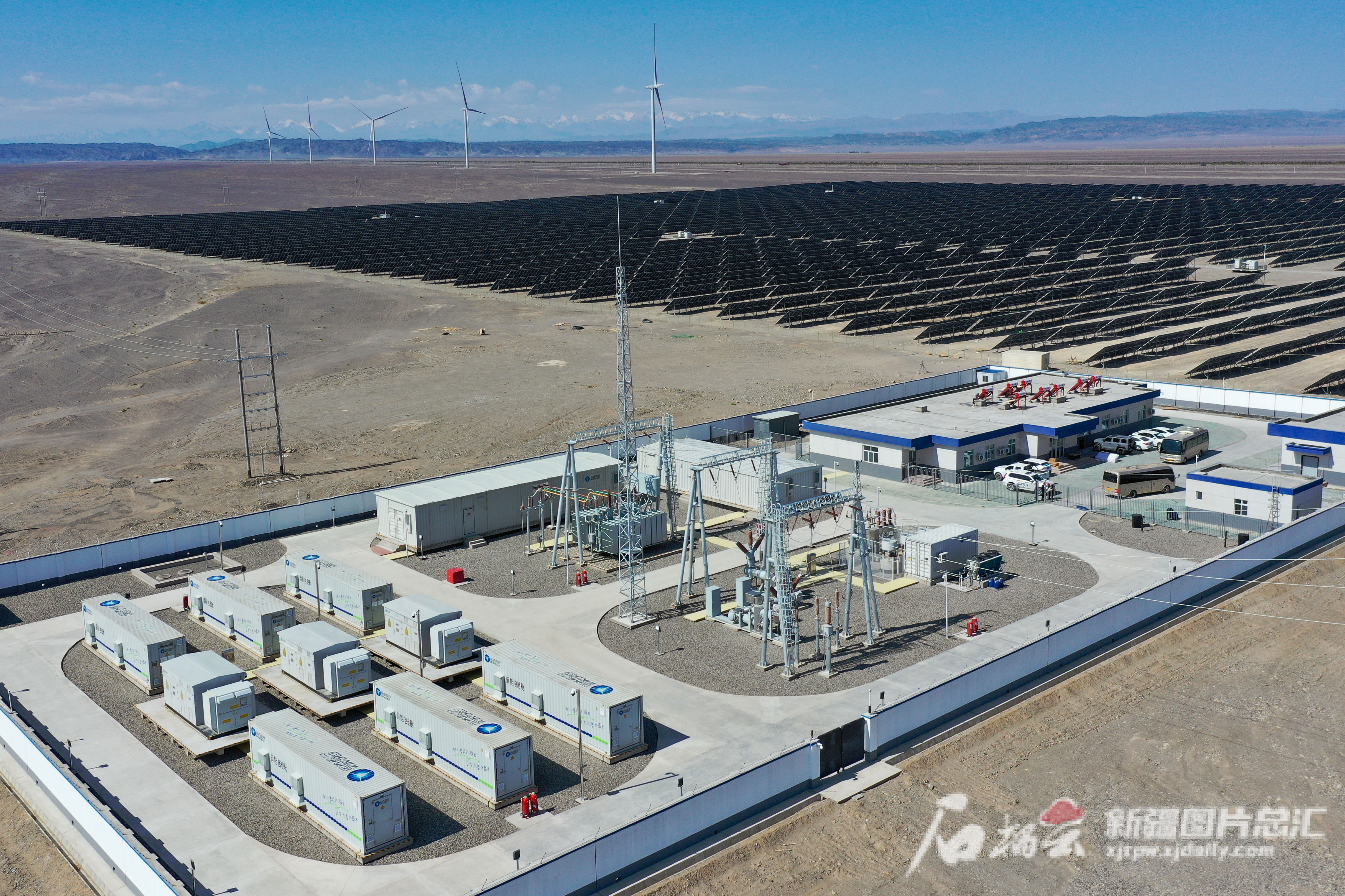 6月18日,俯瞰位于伊吾县淖毛湖镇的哈密兴疆鲲鹏新能源有限公司风光储一体化电站(无人机拍摄)。