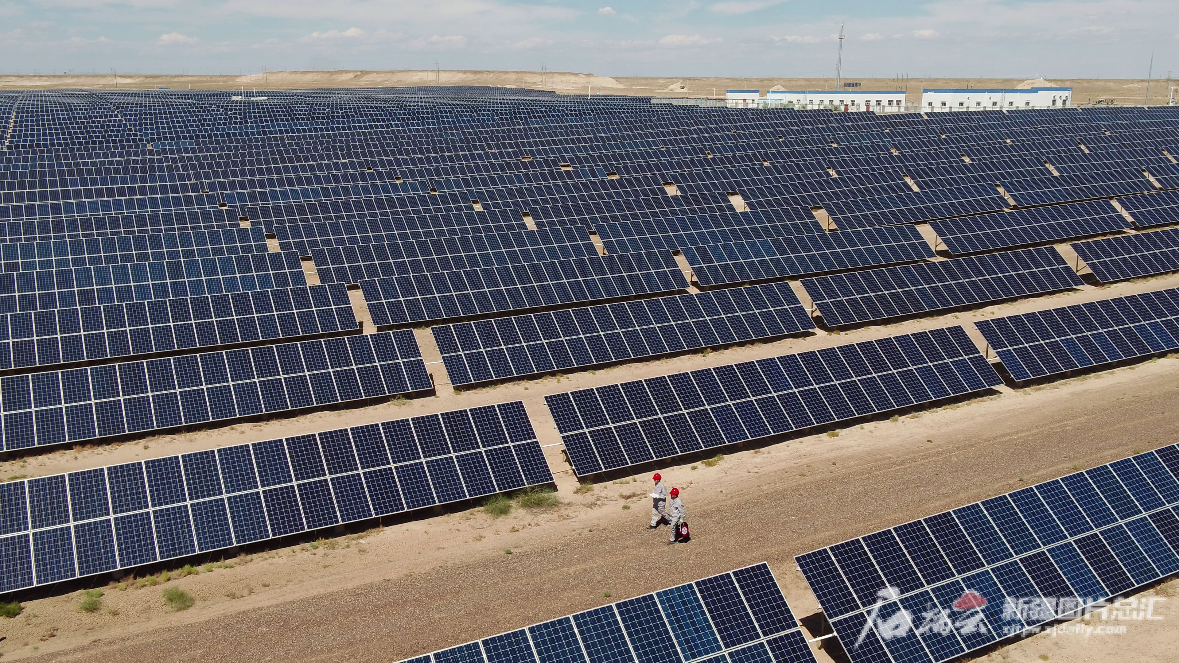 7月28日,位于和布克赛尔蒙古自治县的中核新能源有限公司海天达夏孜盖光伏开关站工作人员进行日常巡检(无人机摄)。何承强 摄