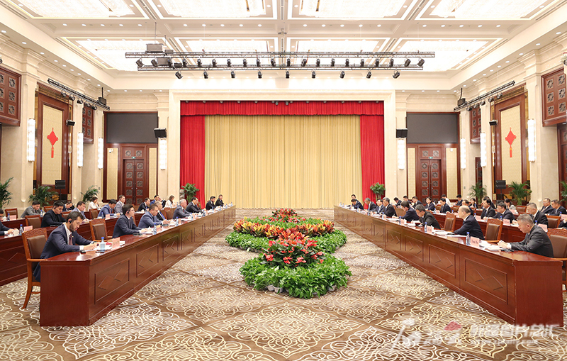 8月16日,自治区党委书记马兴瑞在乌鲁木齐会见来新疆出席2023(中国)亚欧商品贸易博览会的哈萨克斯坦副总理兼贸易和一体化部部长茹曼加林一行。石榴云/新疆日报记者 崔志坚摄
