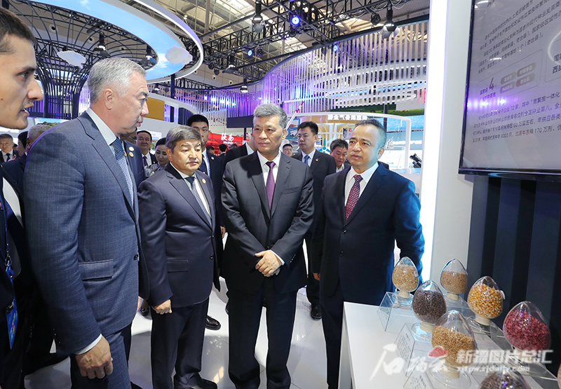 开幕式前,吉尔吉斯斯坦总理阿·扎帕罗夫,哈萨克斯坦副总理兼贸易和一体化部部长茹曼加林,自治区党委书记马兴瑞,自治区党委副书记、自治区主席艾尔肯·吐尼亚孜等外国嘉宾、自治区领导和部分嘉宾共同巡视展馆。这是阿·扎帕罗夫、茹曼加林、马兴瑞、艾尔肯·吐尼亚孜等在昌吉回族自治州展区了解新疆种业发展情况。石榴云/新疆日报记者 周鹏摄