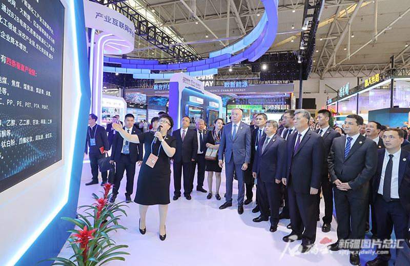 开幕式前,吉尔吉斯斯坦总理阿·扎帕罗夫,哈萨克斯坦副总理兼贸易和一体化部部长茹曼加林,自治区党委书记马兴瑞,自治区党委副书记、自治区主席艾尔肯·吐尼亚孜等外国嘉宾、自治区领导和部分嘉宾共同巡视展馆。这是阿·扎帕罗夫、茹曼加林、马兴瑞、艾尔肯·吐尼亚孜等在新疆能化网平台展位前了解产业互联网平台建设和发展情况。石榴云/新疆日报记者 周鹏摄
