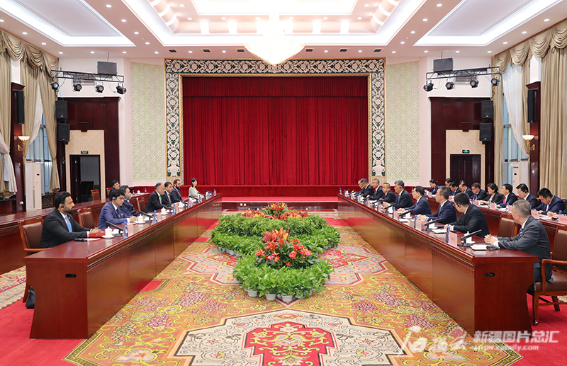8月19日,自治区党委书记马兴瑞、自治区主席艾尔肯·吐尼亚孜在乌鲁木齐会见巴基斯坦计划发展部原部长伊克巴尔一行。石榴云/新疆日报记者 崔志坚摄