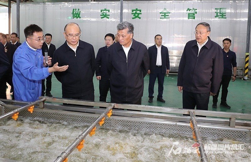 10月11日,马兴瑞、许勤等在兵团第十师183团现代农业产业园考察鲜食玉米加工产业。石榴云/新疆日报记者崔志坚摄