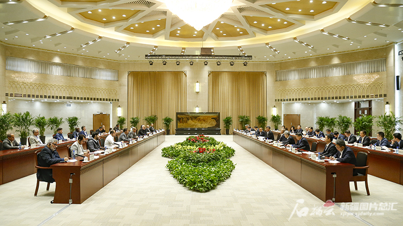 11月1日,自治区党委书记马兴瑞、自治区主席艾尔肯·吐尼亚孜在乌鲁木齐会见来新疆参访的西亚和北非国家宗教界和媒体人士代表团一行。石榴云/新疆日报记者 谢龙摄